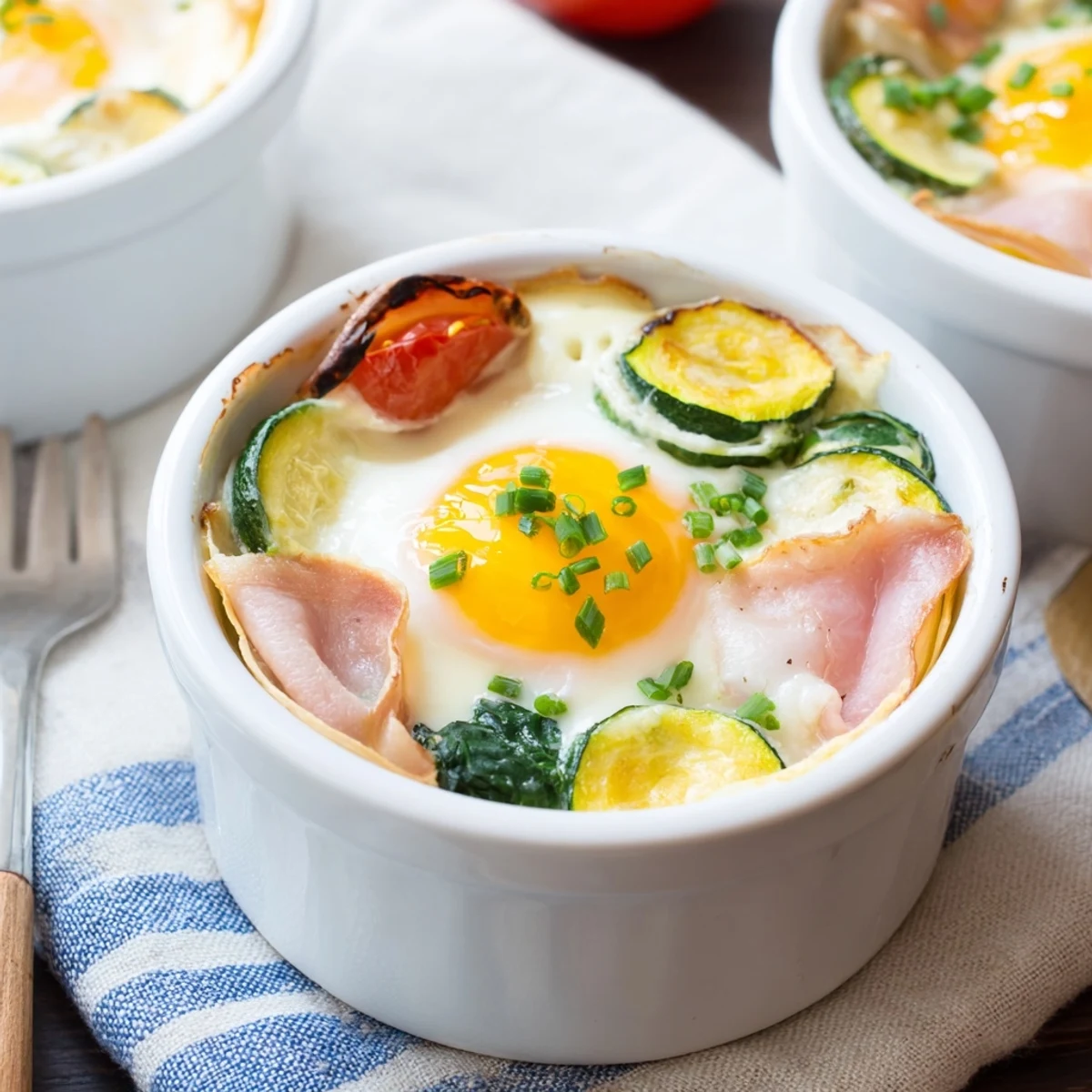 - Place pastry or brioche in each ramekin, then arrange spinach, zucchini slices, tomato, and ham or mushrooms in even layers