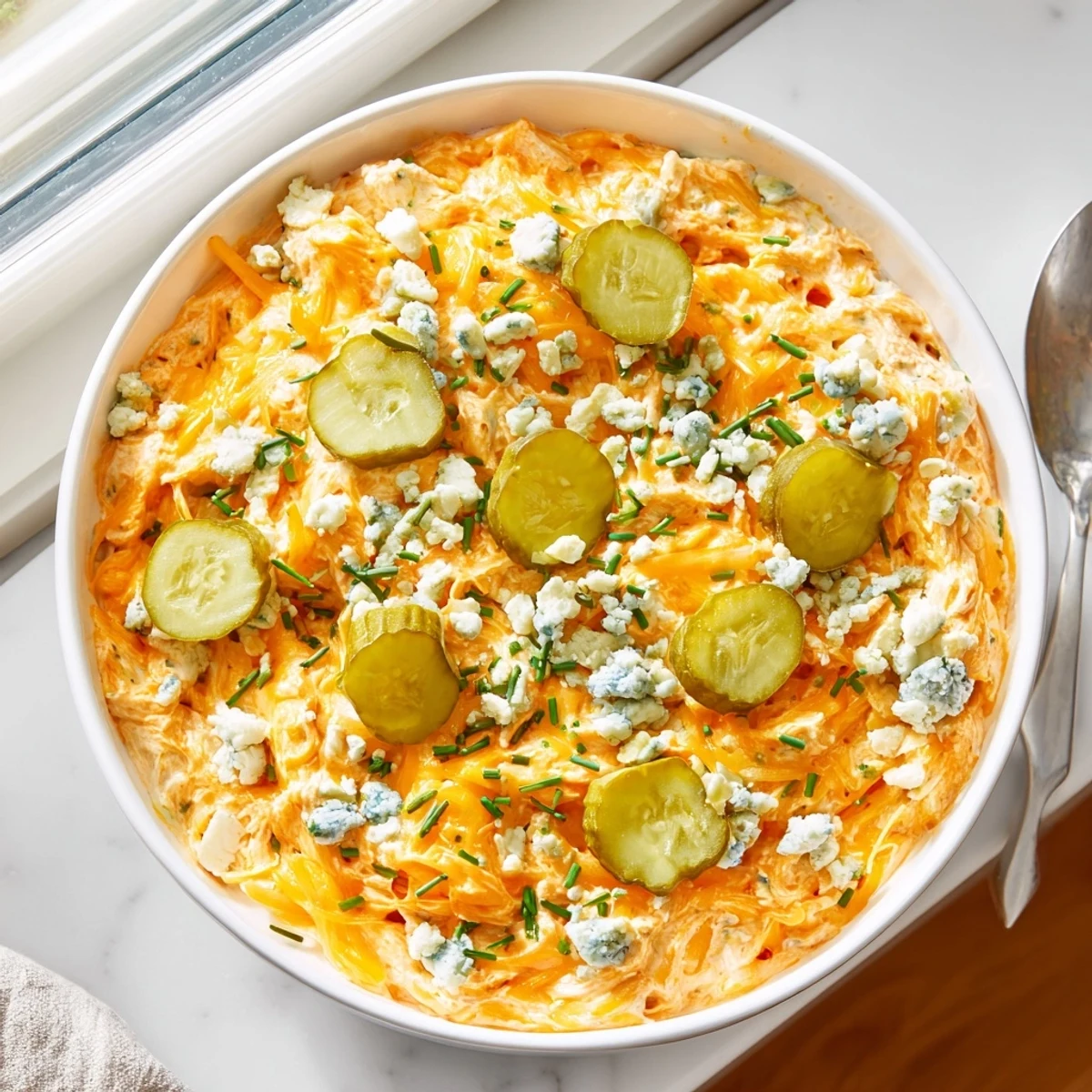 This tangy, creamy blend brings together the bold kick of buffalo wing sauce with the satisfying crunch of dill pickles. A rich base of cream cheese, sour cream, and mayonnaise creates the perfect canvas for shredded cheddar and optional blue cheese crumbles. Fresh chives and garlic powder add layers of flavor that make this a crowd-pleasing choice for any casual gathering.