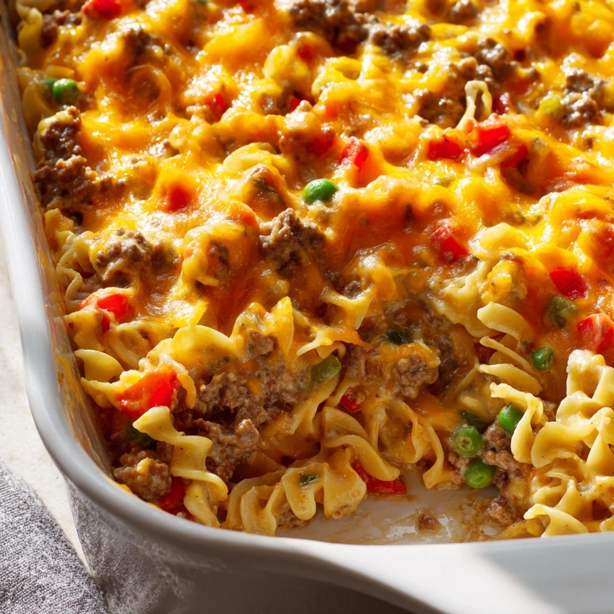 A hearty, satisfying bake that brings together egg noodles, browned ground beef with tomatoes and herbs, and plenty of melted cheddar cheese. The sour cream and mushroom soup create a rich, creamy sauce that binds everything together while the cheese topping becomes golden and bubbly in the oven. This dish comes together quickly on the stove before baking, making it ideal for busy evenings. Perfect for feeding a family or bringing to gatherings, it pairs beautifully with a simple green salad or steamed vegetables.