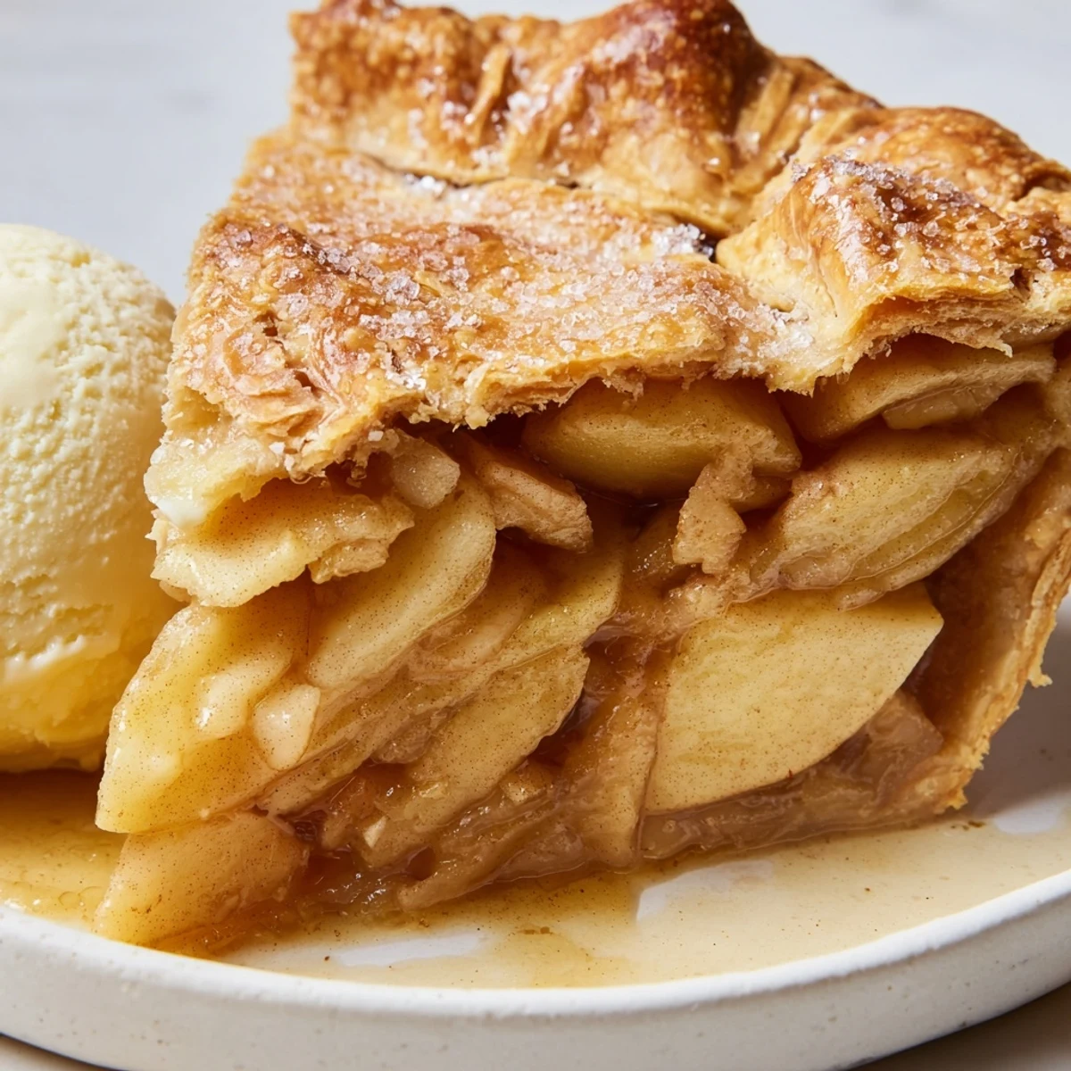 A slice of warm apple pie transforms into something extraordinary with a scoop of vanilla bean ice cream melting into the crevices.