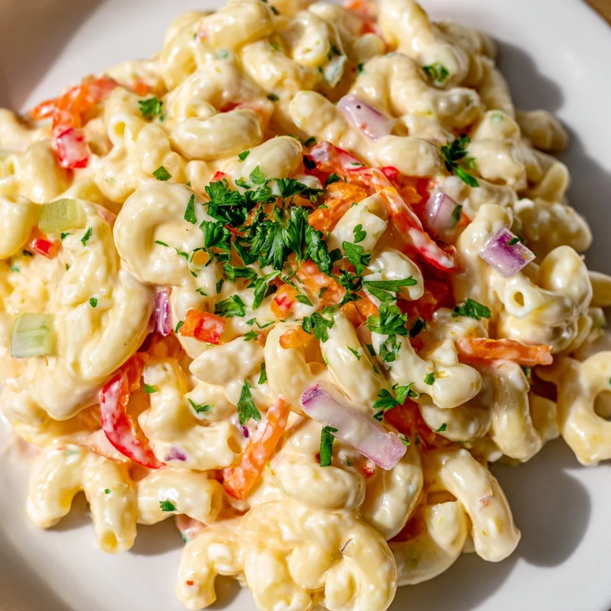 This classic macaroni salad combines tender elbow pasta with finely diced celery, red bell pepper, red onion, and shredded carrots for satisfying crunch. The creamy dressing features mayonnaise blended with sour cream, Dijon mustard, and apple cider vinegar for that signature tangy flavor. Refrigerate for at least an hour to let the flavors meld together perfectly.